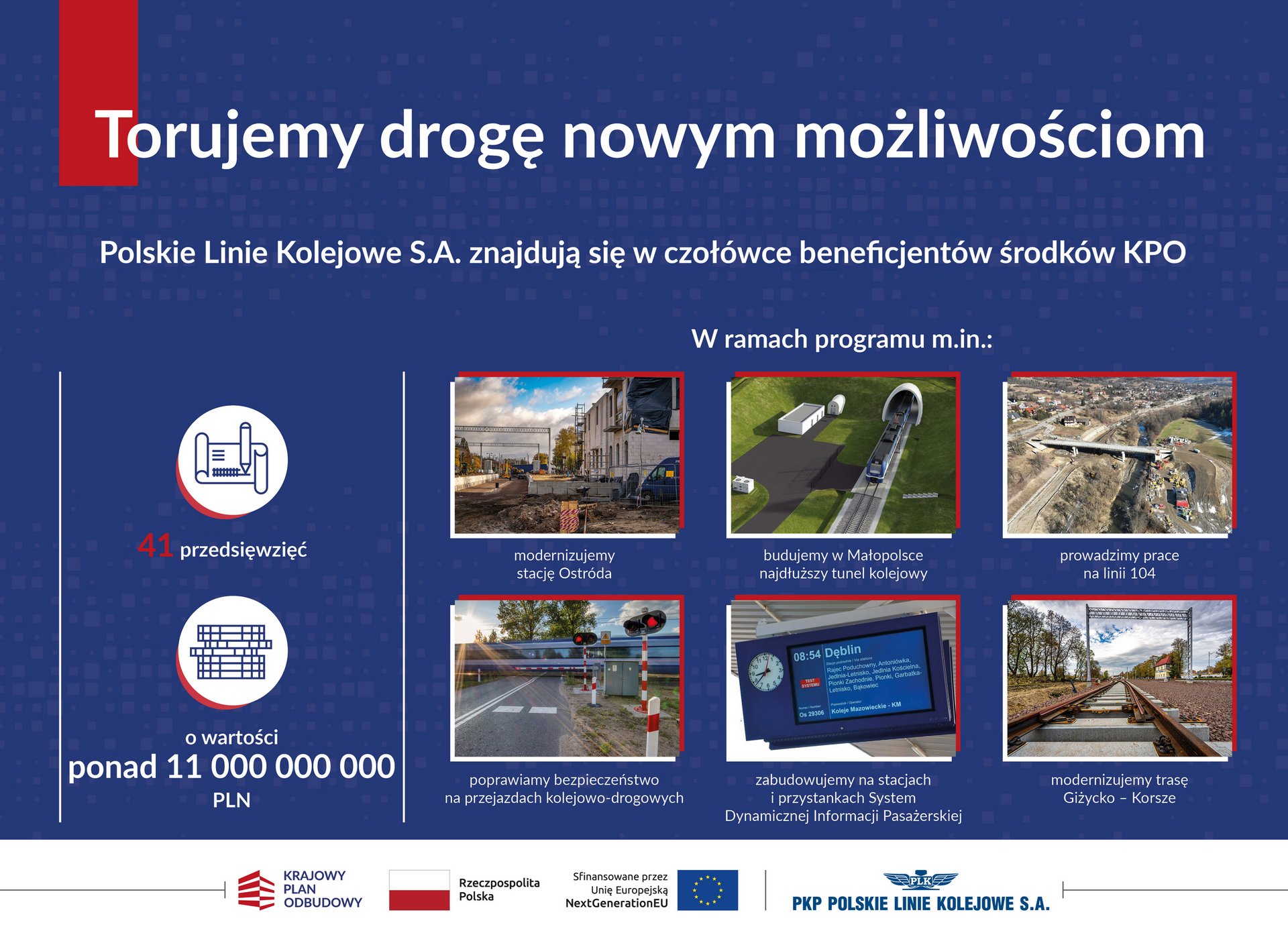 PKP Polskie Linie Kolejowe S.A znajduje się czołówce beneficjentów środków KPO. Uzyskały dofinansowanie dla 41 przedsięwzięć o wartości ponad 11 MLD PLN.